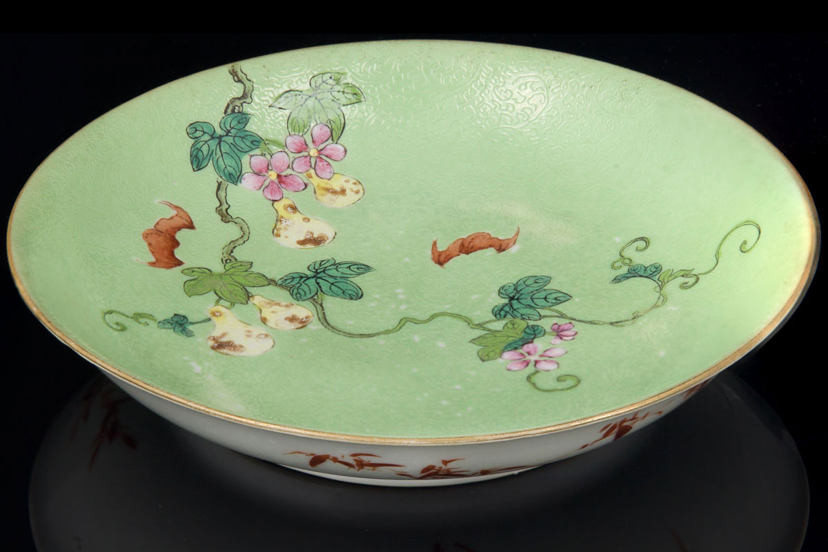 A pair of famille rose green ground scrafiatti saucer dishes with bats, Qianlong mark and period