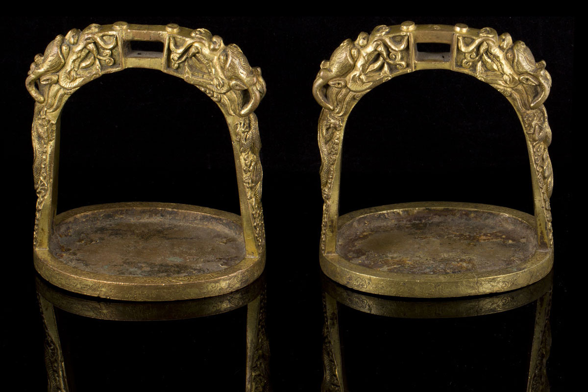 A rare pair of early Qing five clawed dragons gilt bronze stirrups