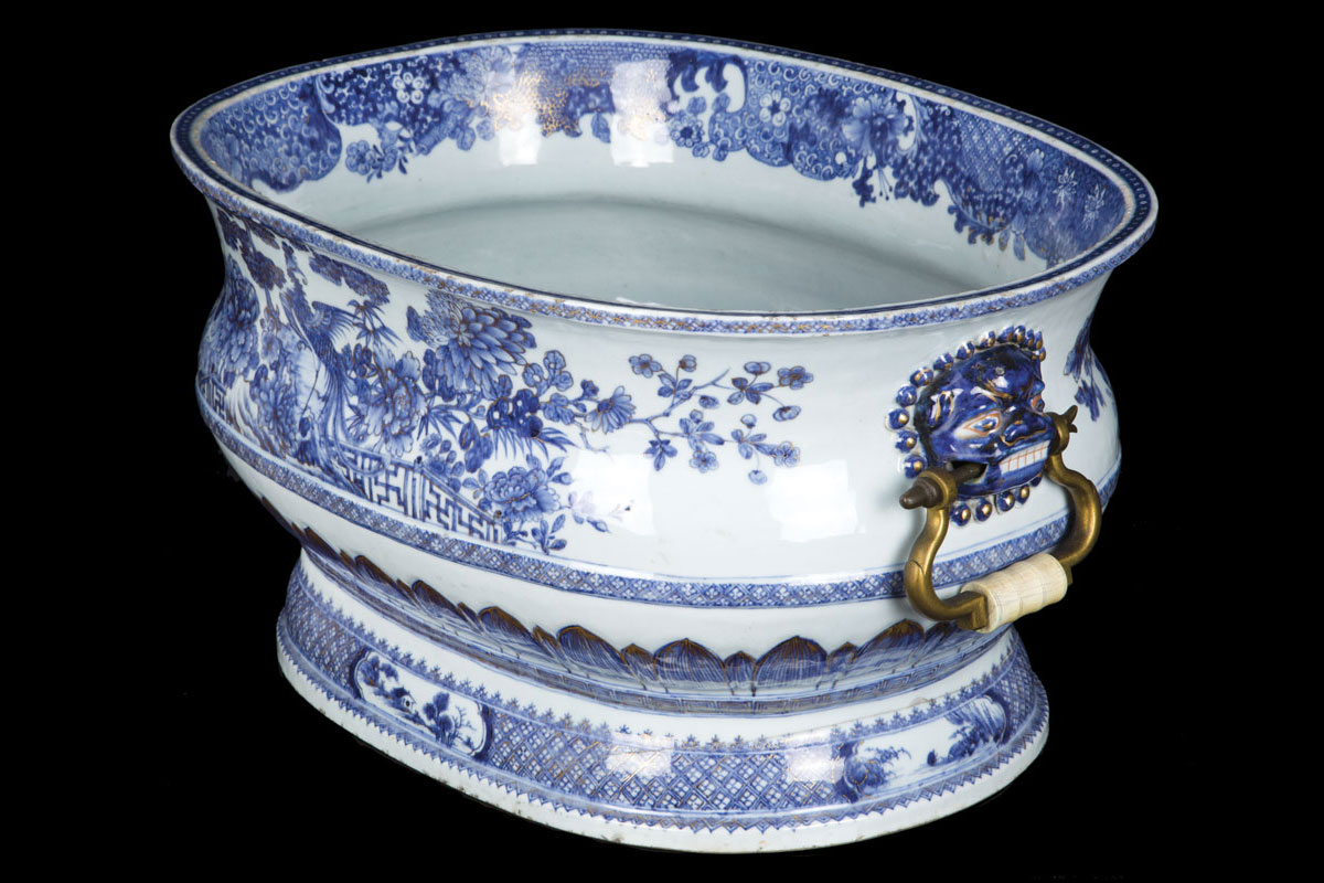 A large blue and white gilt oval cooler painted with phoenix amidst fine flowersprays in a rocky scape, both sides applied with lion masks, each mounted with a european gilt bone and bronze handle.